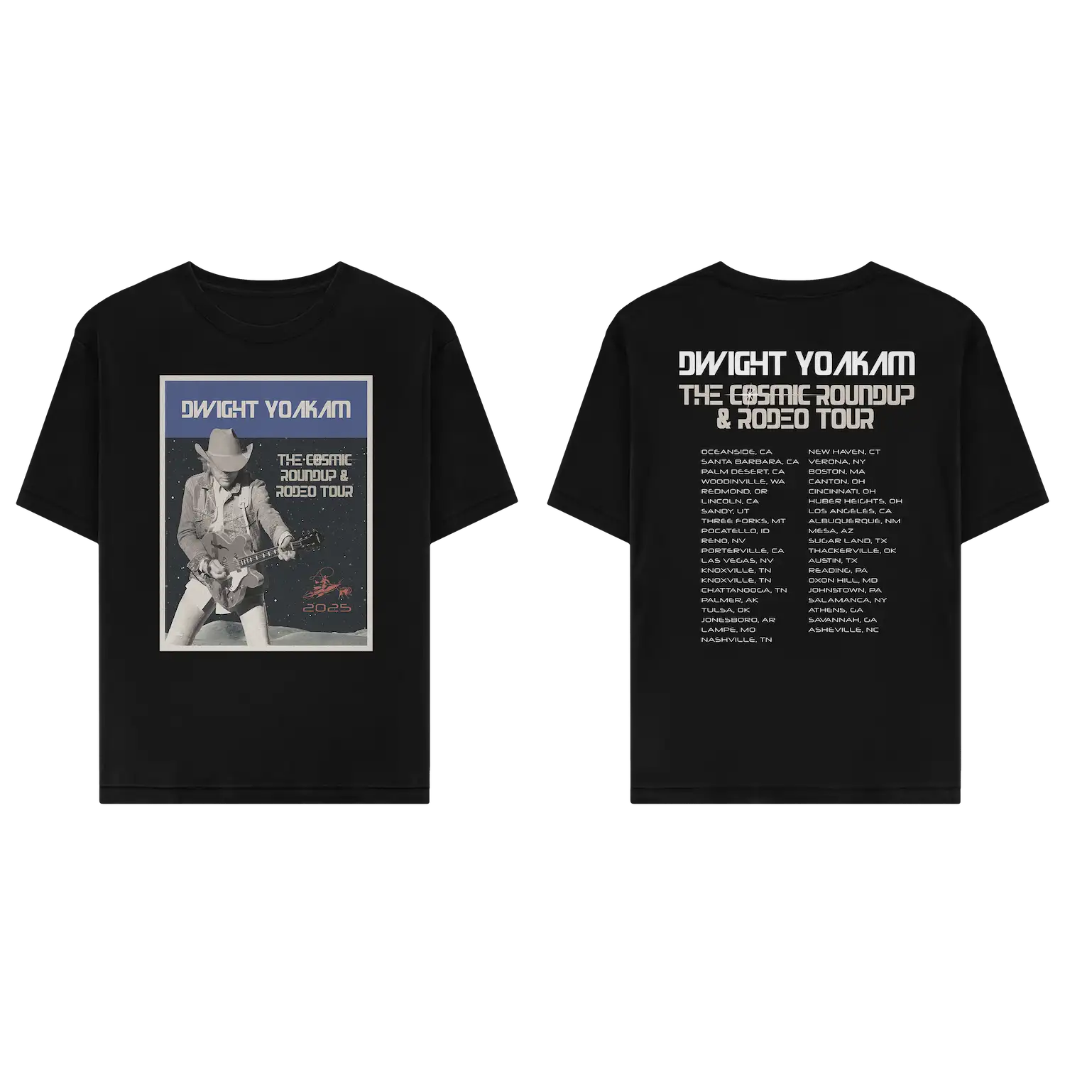 Black unisex t-shirt with tour graphic on the front and 2025 tour dates on the reverse