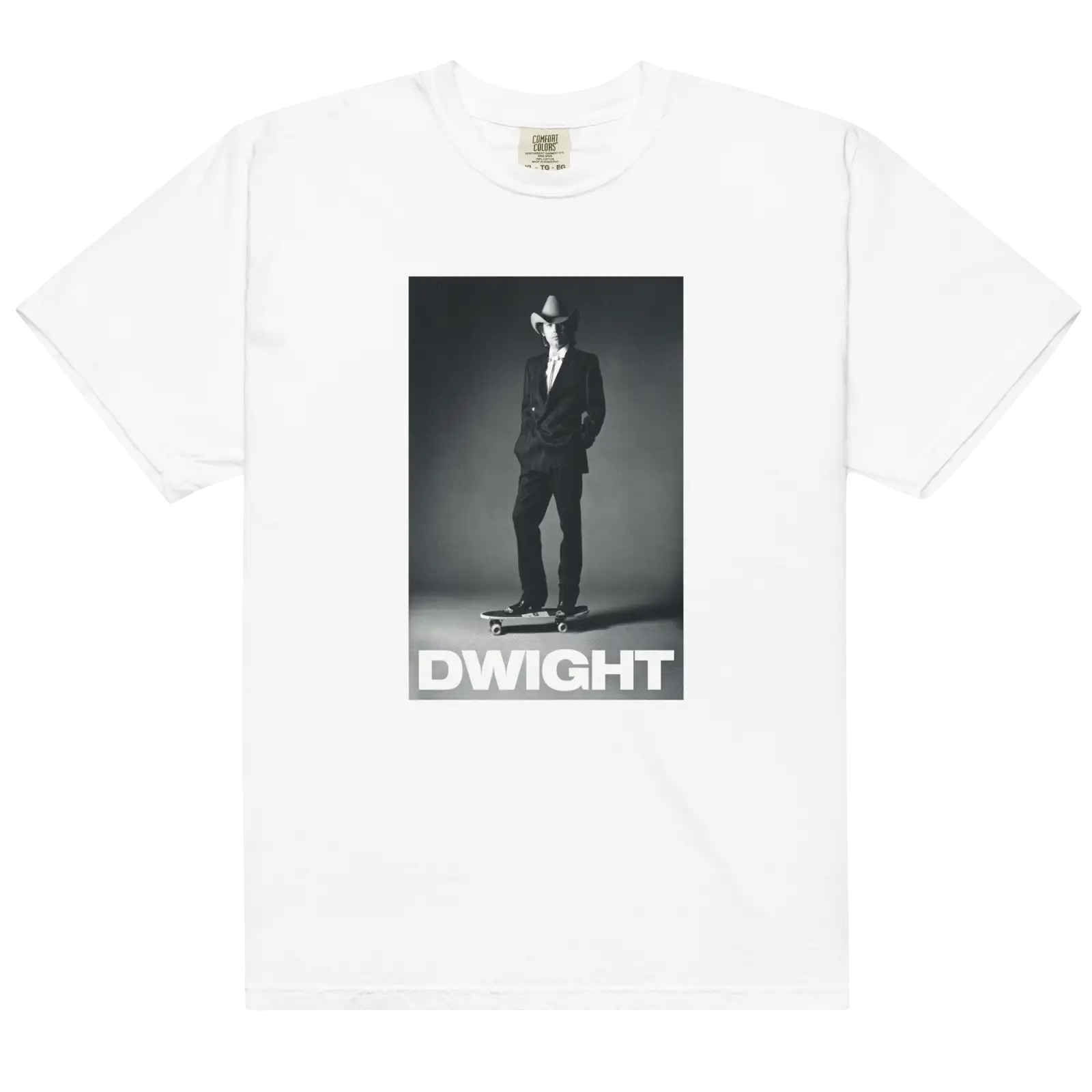 White, unisex t-shirt with Dwight logo and skateboarding image on the front.